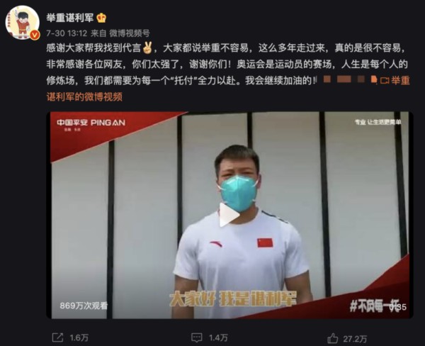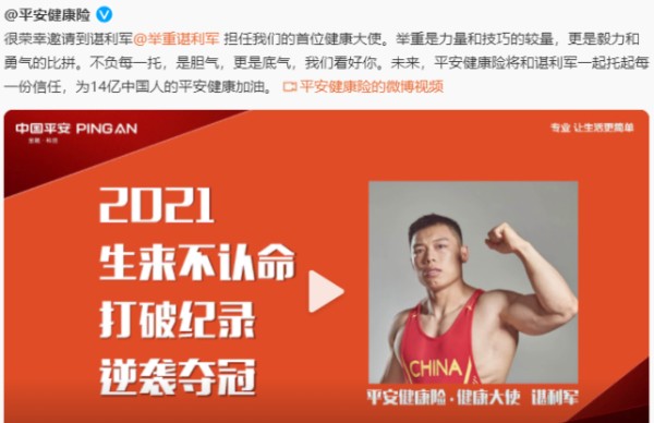 虽然可能并没直接的关系,但得到新代言的举重选手谌利军特意发微博感谢为他争取代言的广大网友。7月30日,中国平安旗下平安健康险宣布谌利军成为品牌健康大使,并为其量身定制了广告语“为每一个‘托付’全力以赴”。可以说,网友声量有时候确实助推了品牌与运动员之间的合作机会。