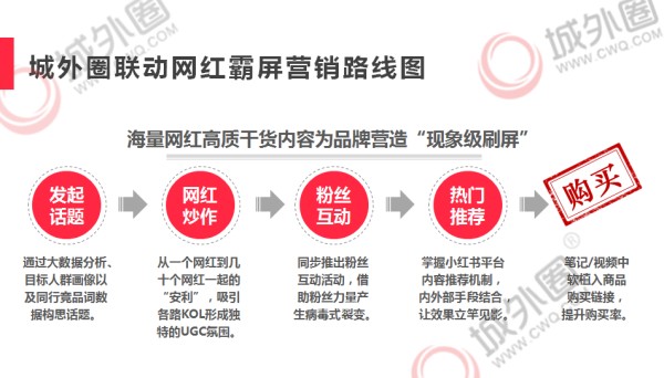 深谙小红书营销策略的城外圈在500+小红书推广案例中总结出一套高效的营销方案——“联动网红霸屏策略”。城外圈利用智能大数据系统帮助品牌建立用户画像,制定传播目标,筛选网红资源;选取话题,让头部网红与中部网红同时“安利”,打造话题热度,吸引其他小红书kol加入话题,形成独特的UGC氛围,刺激粉丝阅读;当话题形成一定热度,再联动网红协助品牌推出营销活动,借助粉丝“口碑传播”进行用户裂变,完成销售闭环。