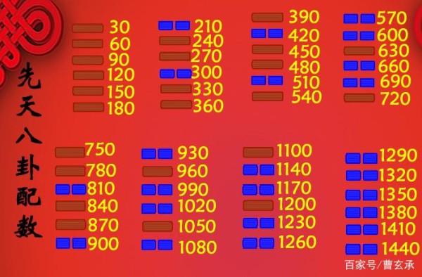1、乾卦配数:乾卦上九爻配数30、九五爻配数60、九四爻配数90、九三爻配数120、九二爻配数150、初九爻配数180。