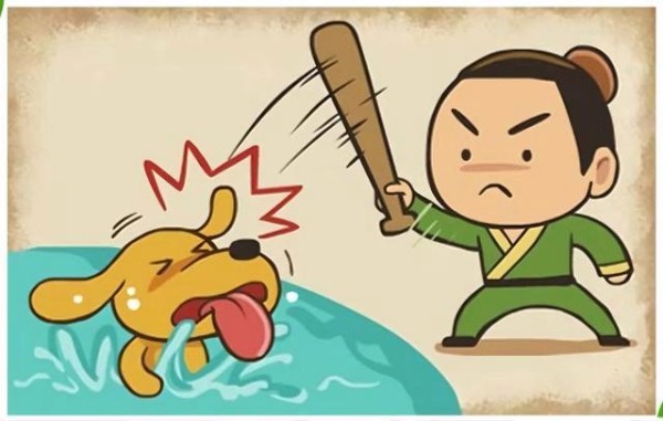 一条小黄狗掉到水里了,一个古代小男孩拿着棒子凶狠地打它,太残忍了!