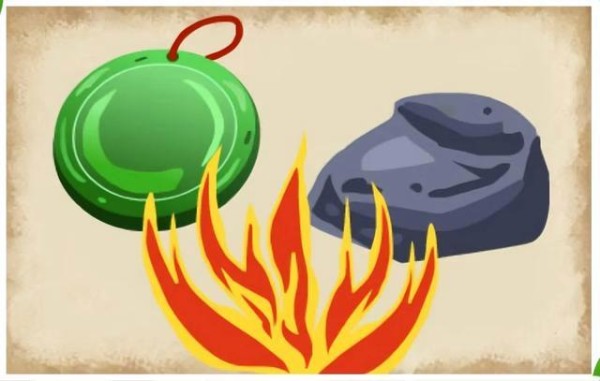 一堆大火在熊熊地燃烧着,旁边有一块翡翠玉佩,还有一块黑色的石头。