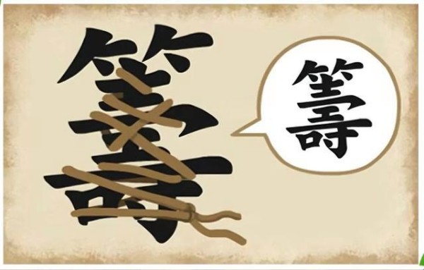 一个大大的黑色繁体字“籌”,周围缠满了绳子,把它绑得紧紧的。旁边还有一个像是在想象的白色圈圈,圈圈内也有一个繁体字“籌”。