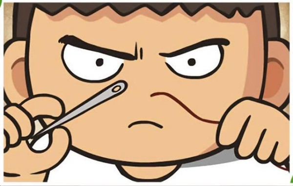 一个小男孩瞪大眼睛,一手拿着针,一手拿着线,在穿针引线呢!可是他穿了半天都没穿过去,耳朵都憋红了。