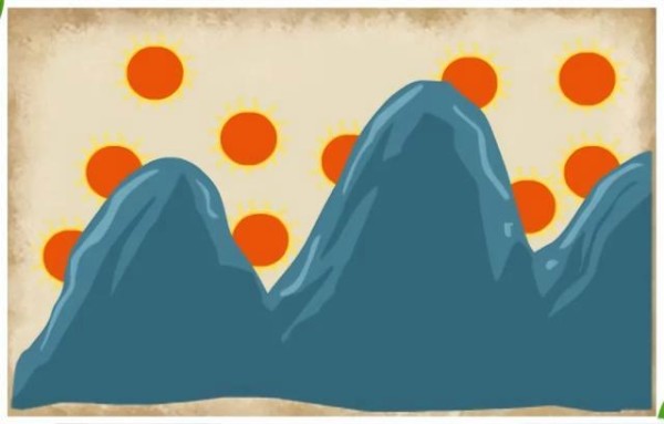 三座大山的后面,有10个橘红色的太阳在缓缓地升起。
