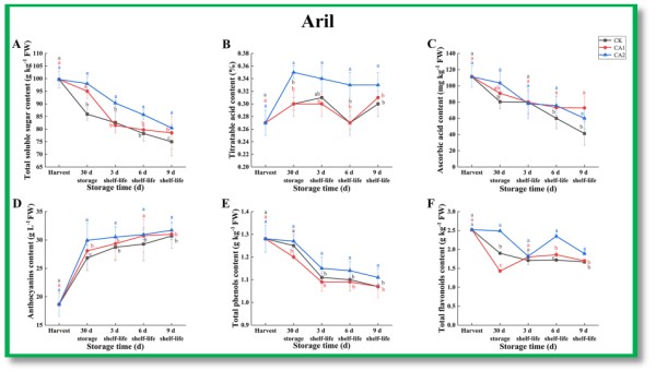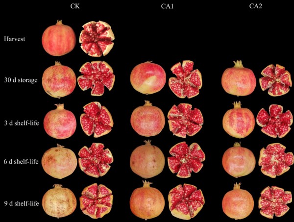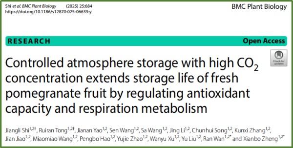 2025年5月,园艺学院苹果逆境生物学与简约栽培技术团队在BMC Plant Biology(中科院2区TOP,IF 4.8)发表题为“Controlled atmosphere storage with high CO2 concentration extends storage life of fresh pomegranate fruit by regulating antioxidant capacity and respiration metabolism”的研究论文。石榴对低温敏感,易产生冷害。该研究基于7% O2 + 4% CO2 (CA1) 和 2% O2 + 5% CO2 (CA2) 两种低温气调贮藏,常规空气为对照,探究鲜食石榴保鲜的营养指标、外观品质、和生理生化变化,通过能量代谢、呼吸速率、ROS清除能力等方面解析了较高的二氧化碳条件(CA2)可以有效降低石榴果实的营养损耗,如,花青素、总黄酮、维生素C等含量,并延长石榴的贮藏期。