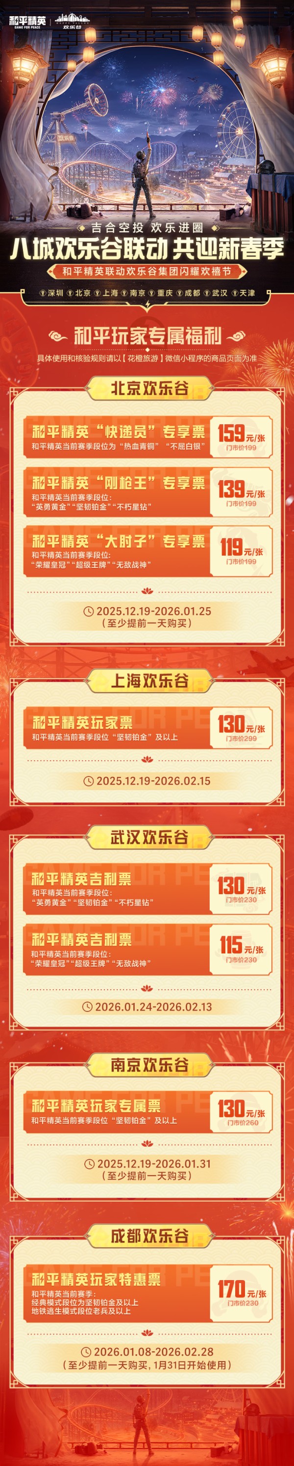 吉合空投,欢乐进圈!新年伊始,《和平精英》官宣开年大动作:将于整个新春期间,携手国内主题公园领军品牌——欢乐谷集团,推出一场覆盖全国、融汇虚拟与现实的大型跨次元实景联动。该活动作为欢乐谷“闪耀欢禧节”年度盛典的重要组成部分,已在深圳、北京、上海、天津、重庆、成都、武汉及南京八座城市同步落地。