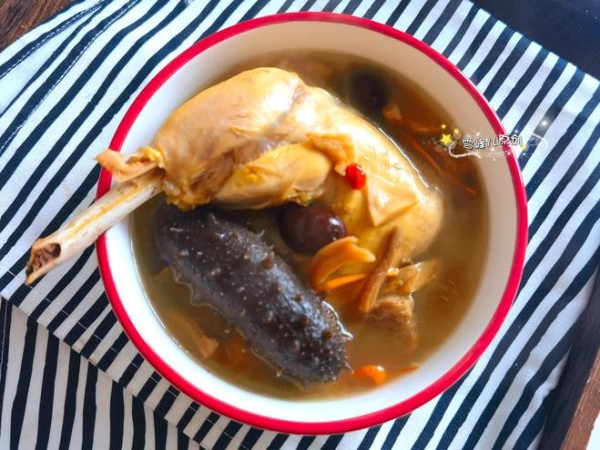 2,改成小火慢慢地炖大约45分钟,加入适量的盐喝海参继续炖大约15分钟,最后撒入几粒枸杞,关火即成。