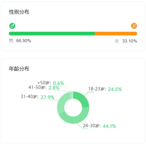 据热浪数据提供的最新粉丝画像,该账号视频粉丝中56.45%的粉丝为男性,而在直播画像中,男性粉丝占比66.9%。此外,直播用户吸引的大多数90后和00后年轻人,24-31岁的人群占比最高,占比 44.1%。
