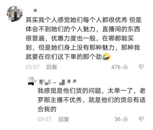 一位网友在“美少女嗨购go”评论区写道,“我感觉是他们货的原因,太单一了,老罗那主播不优秀,就是他们的货总有适合我的。”