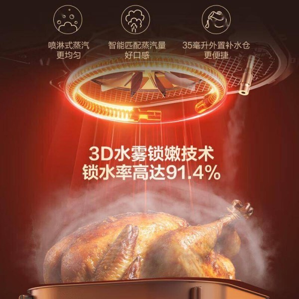 独家研发的蒸汽补水系统能在烹饪过程中自动补充水分,防止食物过干,尤其适合鸡胸肉、牛排等容易变柴的食材,保留更多汁水和营养。