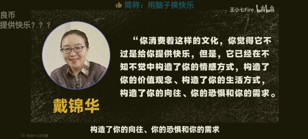北京大学中文系教授戴锦华(截图2):“你消费着这样的文化,你觉得它不过是给你提供快乐。但是,它已经在不知不觉中构造了你的情感方式,构造了你的价值观念、构造了你的生活方式,构造了你的向往、你的恐惧和你的需求。