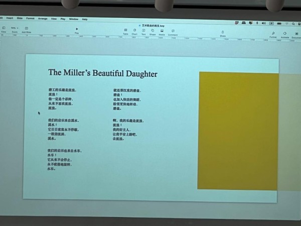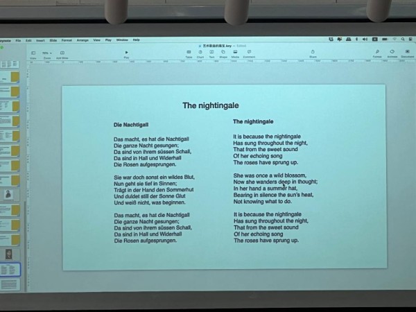 19世纪欧洲社会及作曲家对诗歌的高度关注,得益于优秀诗人在欧洲的井喷式出现,最有代表性的是人包括席勒、康德、海涅等。这也从一定层面上确立了德奥艺术歌曲的领先地位。而“韵文”(verse)即为此时期的一种重要写作范式,金平教授巧妙的将其与中国的“词曲”做类比,阐述了德奥诗人诗词中的“分节”(stanza)与诗行(verse)以及中国词曲中的“阙”。作曲家在创作作品时会根据诗文的韵律谱写旋律,达到所谓“音韵结合”的艺术效果,以此力求演唱过程中对诗词本体叙事性的完整表达。金平教授指出,德奥艺术歌曲的成功以及其在声乐领域的重要艺术地位,很大程度上得益于作曲家写作时的“音韵结合”,而这一手法也成为后世声乐作品的重要创作思路。