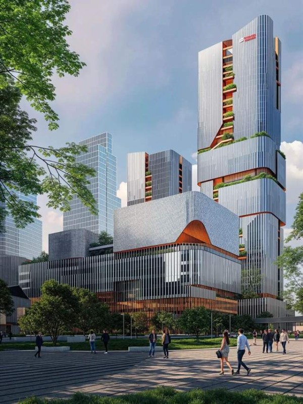 设计通过一条蜿蜒的社交中轴贯穿建筑群,将自然景观转化为立体的行走体验,同时融入骑楼、阳台等岭南元素,并通过绿色设计适应本地气候,营造宜人的微环境。