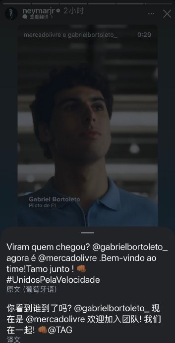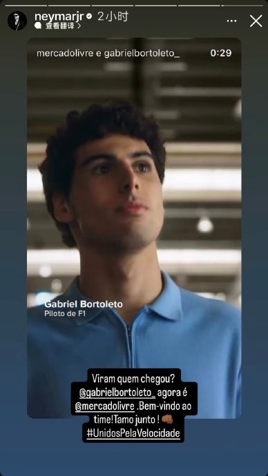 #内马尔[超话]# 马儿ins快拍更新,转发mercado livre和现任F1唯一巴西车手奥迪车队(前索伯车队)的博托莱托,他也加入了马儿代言的mercado livre团队代言