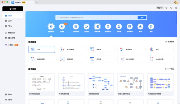 在这里,您可以创建和管理文档、搜索和使用模板、导入Visio或其他格式文件,以及修改软件的常规选项。该界面同时用作万兴图示操作界面的入口。