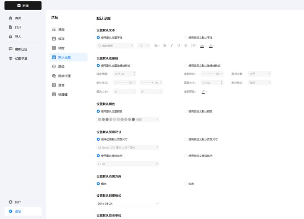 如果您不喜欢系统预设的格式,则可以使用自定义格式设置来自定义形状的样式。转到“文件”菜单,单击“选项”>“默认设置”,然后,选择您喜欢的字体、连接线、主题颜色和页面尺寸。接下来,您就可以用简单直观的方式开始绘制图表了!