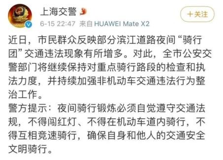 对于此事,上海交警在微博发声,表示针对上海部分地区出现的“骑行团”交通违法行为,全市公安交警部门将继续保持对重点骑行路段的检查和执法力度,并持续加强非机动车交通违法行为整治工作。