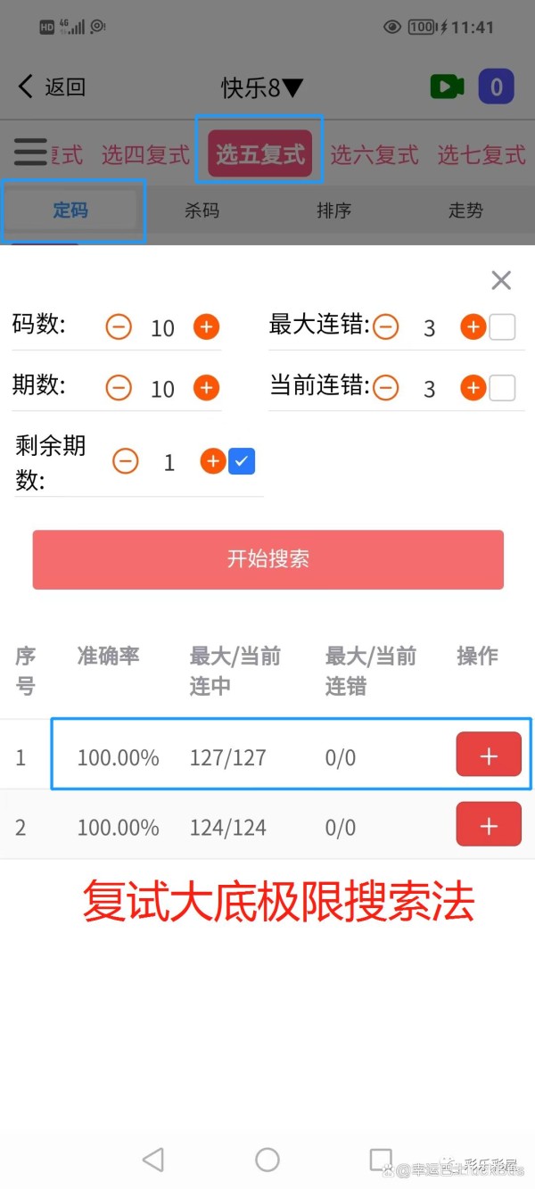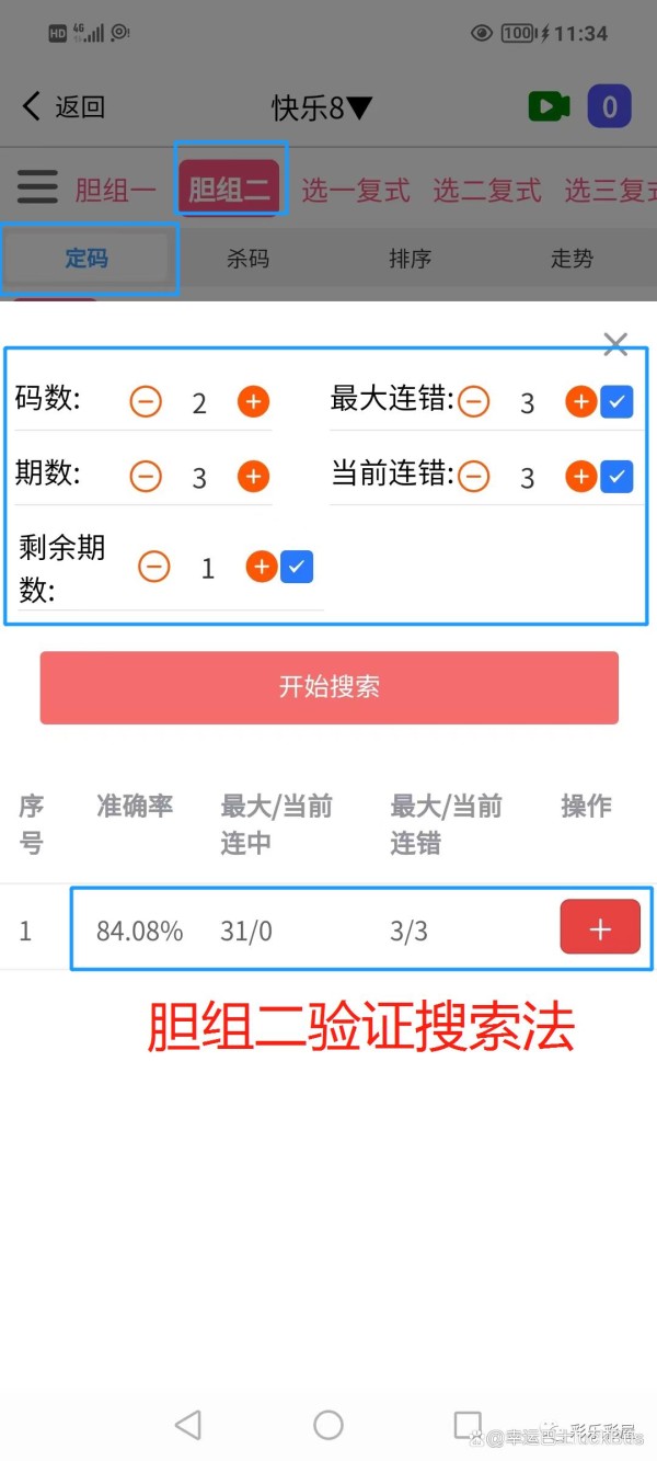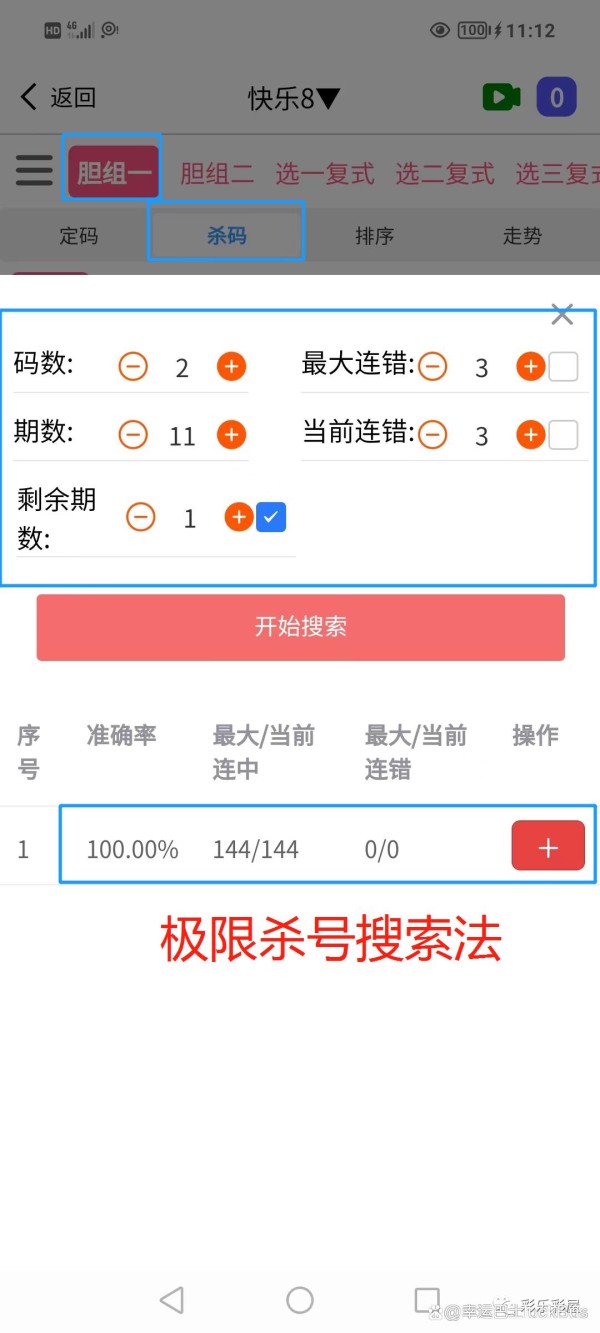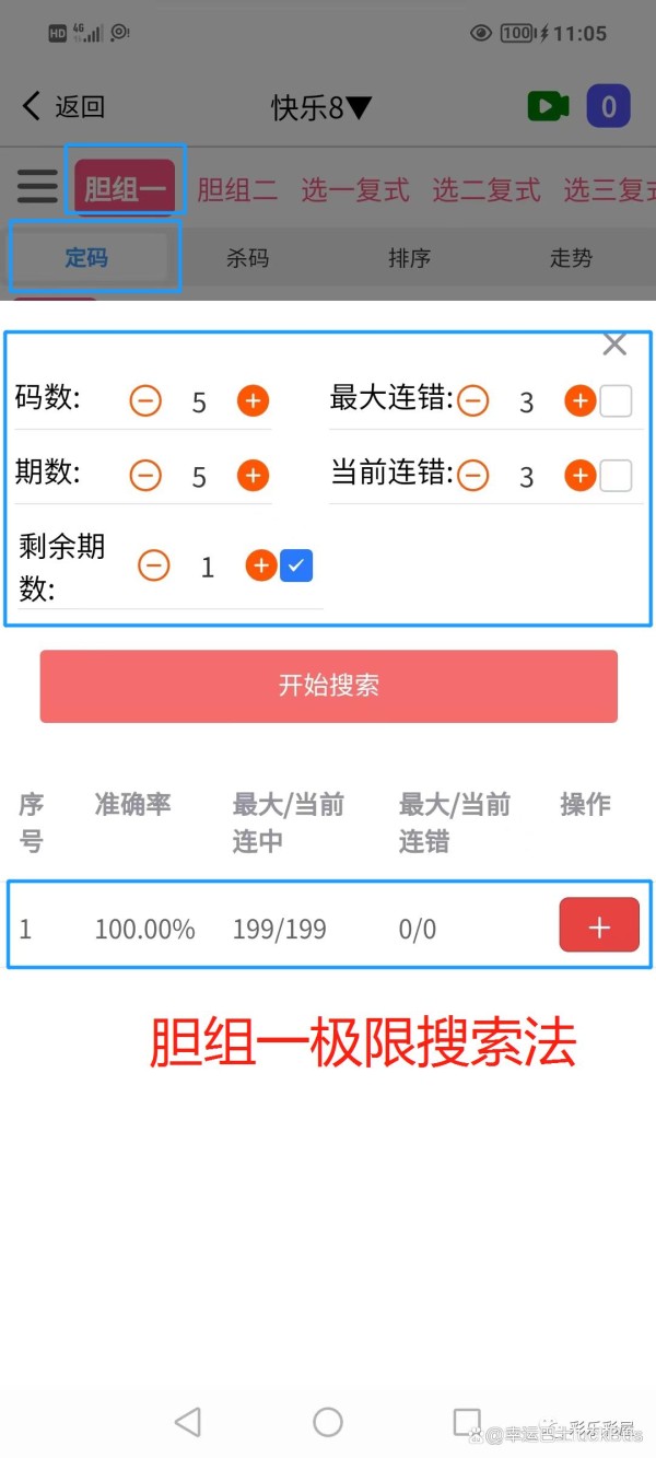 第一步:利用猎手全能王——快乐八(胆组版)搜索出定码杀码(胆组一搜索极限法胆组二搜索验证法),并逐一添加到盯盘当中,根据优选法可以将容错参数设置为0-1或0-2。