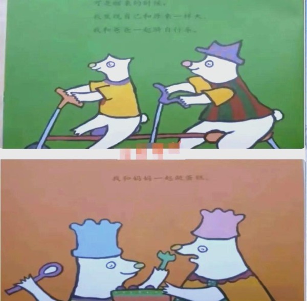 展示图片一,并由教师讲述该段落的情节。看,小熊和爸爸之间发生了什么令人捧腹的事情?小熊身处何处?他是如何得以坐在爸爸的口袋里的?