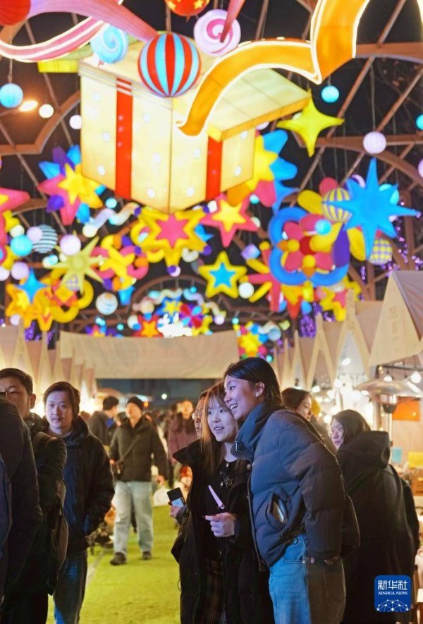 2月1日晚,游客在外滩枫径年味集市休闲游览。新华社记者 刘颖 摄