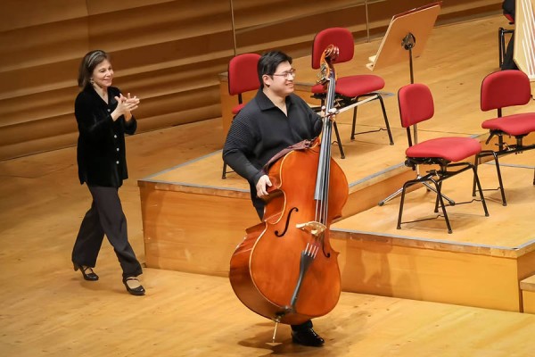以低音提琴作为协奏曲的主角并不多见,而库谢维茨基的这部协奏曲则更是稀罕,但它却是一部极具深度的作品。上海交响乐团低音提琴首席钱博文的独奏堪称是本场音乐会的灵魂时刻。作为独奏家,他不仅展示了低音提琴的宏大音色,更通过细腻的处理,展现了这件乐器鲜为人知的抒情面。是贝斯,是低语,是海潮声,上海交响乐团音乐厅的声场里如同开启了一场冬夜吟游。乔安·法莱塔在指挥这一篇章时,与乐团的配合恰到好处。她没有让独奏声部过度喧闹,而是巧妙地运用乐团的支撑,使得钱博文的每一次呼吸都被完美捕捉。这种指挥方式既体现了她对乐团的掌控力,也展示了她对独奏家的尊重,形成了独奏与管弦乐之间的完美对话。