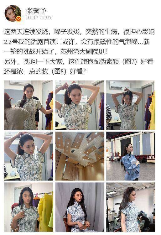 张馨予连续两天发烧、嗓子发炎!坚持穿短旗袍排练话剧,素颜真美