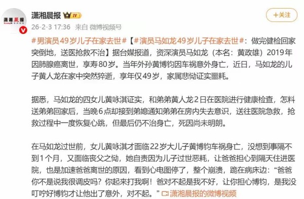 太离奇了!2月3日,演员马如龙的儿子黄人龙被曝在家中去世。