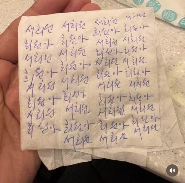 姜元来透露,具俊晔在休息室里,不停地重复播放着一首韩文歌,一边听一边掉泪,「他在纸上不停地涂写着什么。后来在工作人员引导下,俊晔离开了休息室,我回到那个位置帮忙整理时,看到桌上留着一张纸,上面写着『徐熙媛』我担心那张纸会被当成垃圾丢掉,于是把它收了起来。」照片中可见具俊晔在卫生纸上全密密麻麻写着「徐熙媛」、「熙媛啊」,看了让人心疼不已。