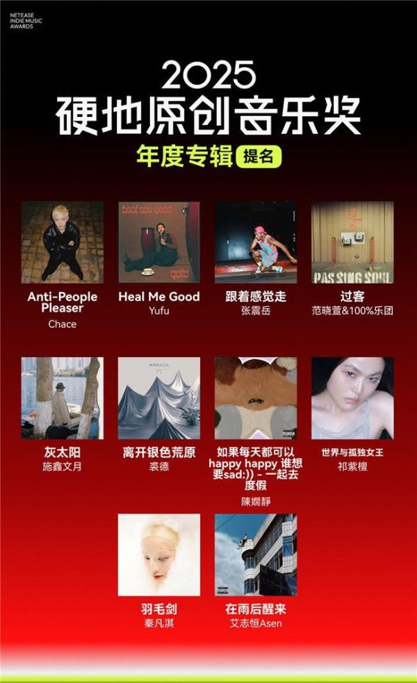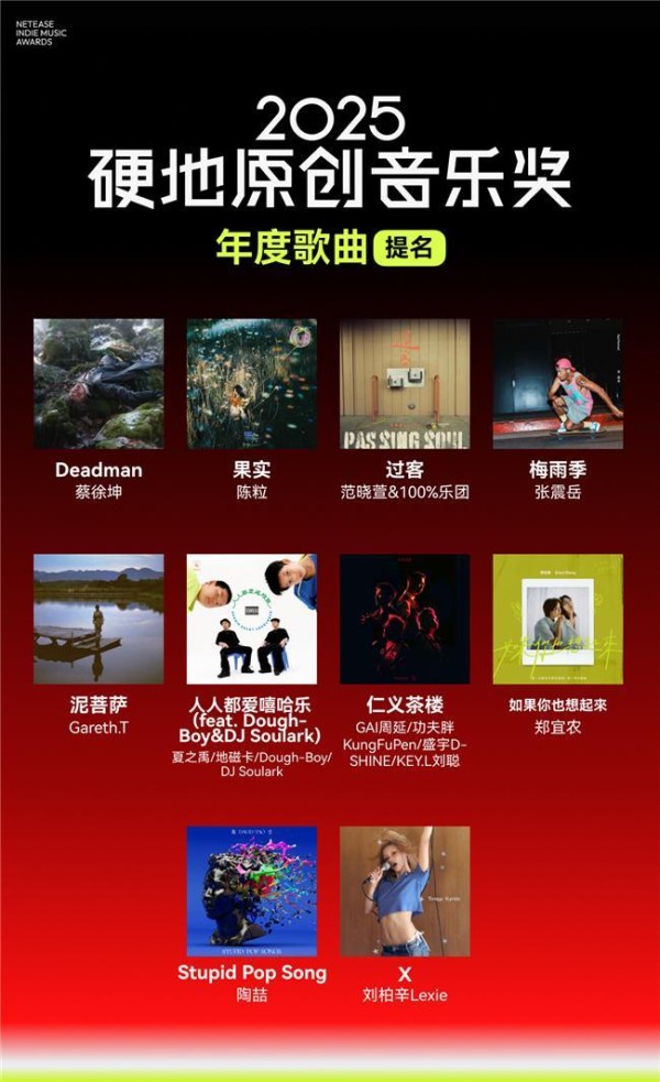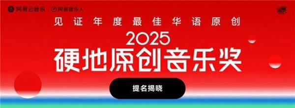 1月28日,网易云音乐2025硬地原创音乐奖提名名单正式发布,艾志恒Asen、Chace、陈粒、陳嫺靜、蔡徐坤、范晓萱&100%乐团、Gareth.T、刘柏辛Lexie、裘德、祁紫檀、施鑫文月、陶喆、张震岳等音乐人获得年度奖项提名。沉默橙、回环 RingAgain、黄业圆等新锐音乐人以亮眼表现入围年度新声。乐迷可在网易云音乐APP搜索“硬地音乐奖”查看完整名单并收听精选歌单。正式获奖名单将于3月公布。