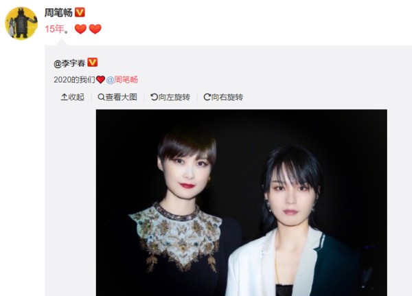 3 / 9 小编看到当年《超级女声》的选手再次同框就非常好奇点进去一看,结果发现是周笔畅亲自 转发的一条微博。大家可以看到一开始是李宇春先发文说道“2020的我们”然后配上了一张近照,而周笔畅就转发配文“15年”。两人都是205年的选秀节目选手,不过节目结束之后,两人是没有同框过。这次趁着活动不仅见面了,还拍下的合照,所以许多网友看到时隔15年后的同框都直呼青回了。