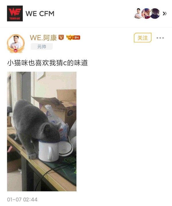 阿康在个人动态晒出了WE队宠猫咪的照片,小猫似乎是将头钻入了小猜的杯子里,看来猫咪也是十分迷恋WE大C小猜,真的是可爱十足了!