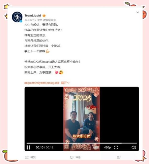 近日,液体战队在社交媒体上发布了一段温馨的拜年视频。视频中,一号位选手micke与五号位选手Insania亲切亮相,向广大玩家致以新年的祝福。同时,他们也表达了对中国的深深思念,并期盼能有机会回到中国,与家乡的粉丝们共同参与比赛。