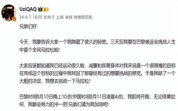 之后又有人看到另一条消息,二〇二四年八月,他对外宣布要去参加巴黎奥运会的大众马拉松,比赛在北京时间八月十一日凌晨四点开跑。