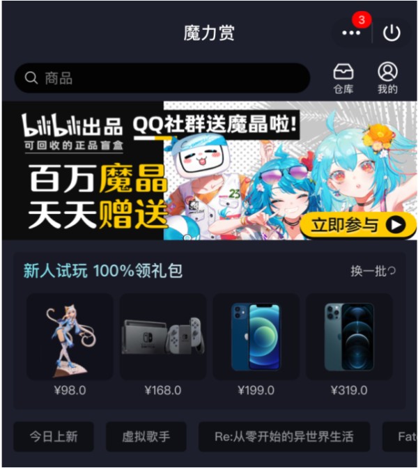在“魔力赏”的QQ小程序首页,我们可以看到,“魔力赏”给新用户提供了一次免费试玩的机会,而且是百分之百的中奖率,也就是说,我们新用户第一次使用“魔力赏”QQ小程序,都可以“白嫖”一个正版动漫周边。