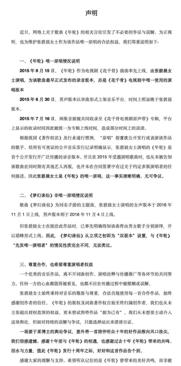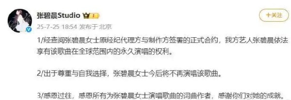 第一条直接亮出杀手锏:“张碧晨依法享有该歌曲全球永久演唱权。 ”