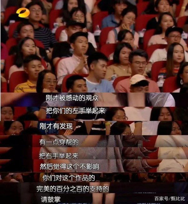 “刚才被感动的观众,请举起你们的左手。刚才我们的光收晚了,工作人员有一点穿帮,看到的请举右手。然后大家觉得这个穿帮,不影响你对这部作品看法,并完美百分百支持的请鼓掌”。