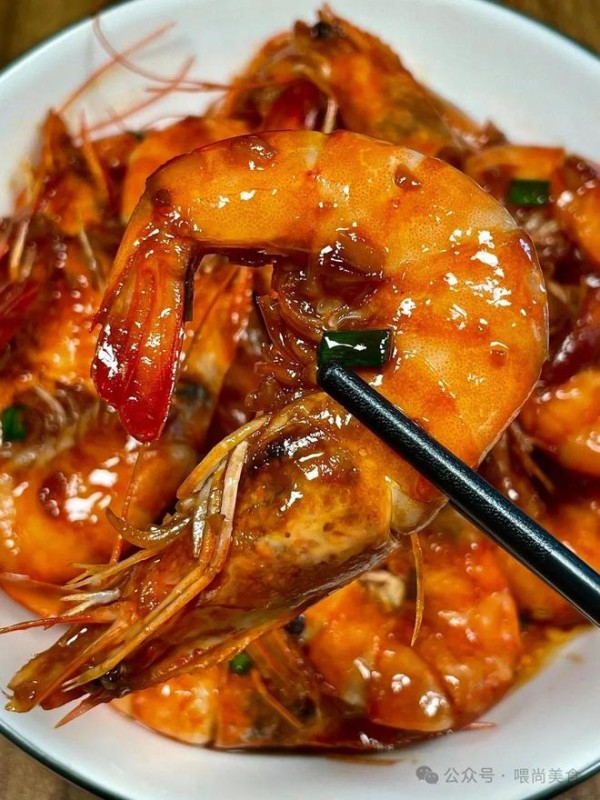 2、调入生抽、老抽、蚝油、料酒、盐、番茄酱,以及适量清水,大火煮制3-5分钟,让虾肉充分吸收汤汁的精华。最后撒入葱段,大火收汁即可。