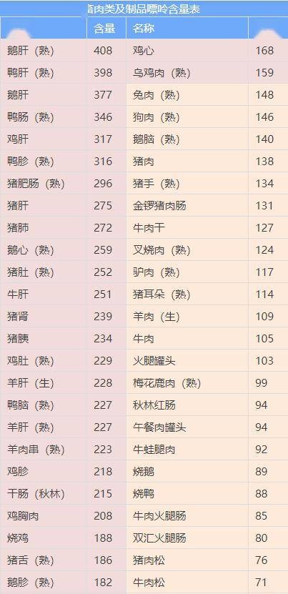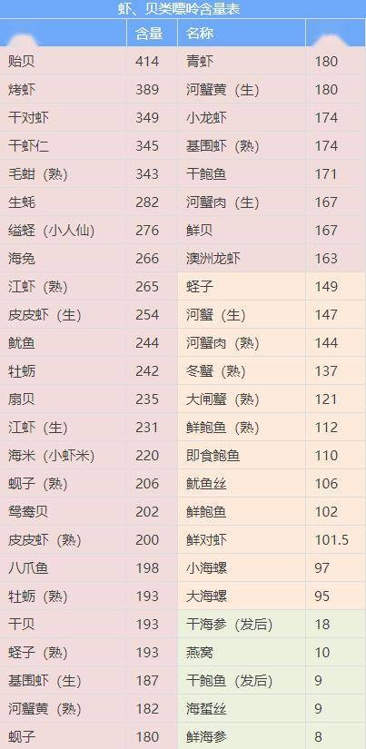 内脏、海鲜>肉类、豆类>主食、谷物>蔬菜、水果