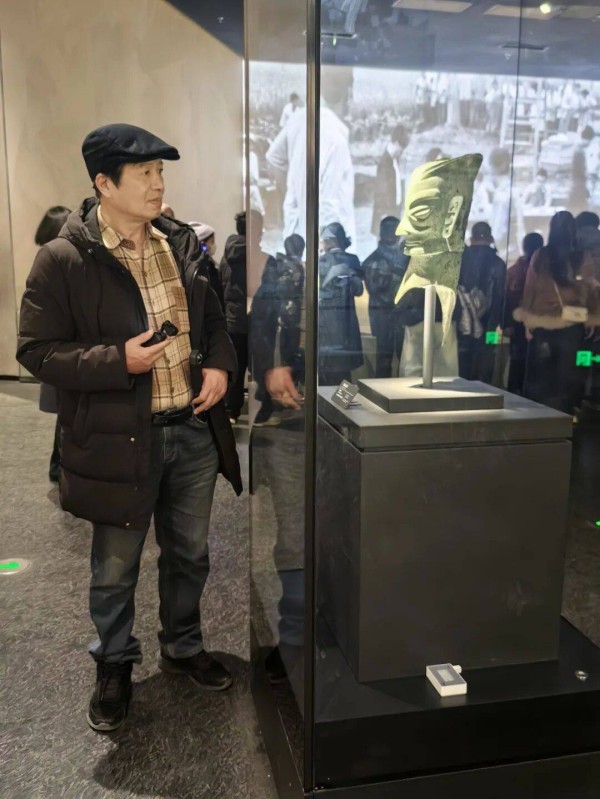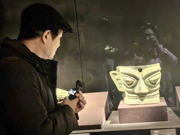 可当我面对三星堆的青铜面具时,那些生活化的幽默瞬间褪去,只剩下深深的震撼与好奇。展厅里的面具们姿态各异,有的戴着高冠,有的露出獠牙,有的眉眼细长如柳叶,有的额头刻着繁复的云纹。最让我着迷的是那些“方脸面具”,棱角分明的轮廓,平直的发际线,仿佛是用直尺量过一般,透着股不容置疑的威严。讲解员说,这些面具可能是古蜀国王侯或巫师的象征,用于祭祀等重要场合。我盯着面具上那双没有瞳孔的眼睛,忽然觉得它们像是在凝视着我,又像是在凝视着遥远的时空,那沉默中似乎藏着无数秘密,等着后人去解读。