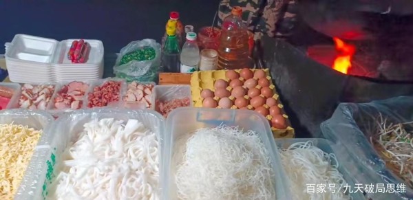 当时他的摊子上还有好几筐米饭和粉面,估计得有五六十份。我看老板这么拼,于是我就问他一天能卖多少钱,结果他说一天能卖千把块钱。听到这数字我有一点小小的惊讶。后面我又问他时间是怎么安排的,他说每天下午5点出摊,晚上一般要卖到两三点,甚至三四点才能回家,白天的话,就要准备食材,蒸米饭,泡米粉等等,真正留给自己的休息时间,其实很少。