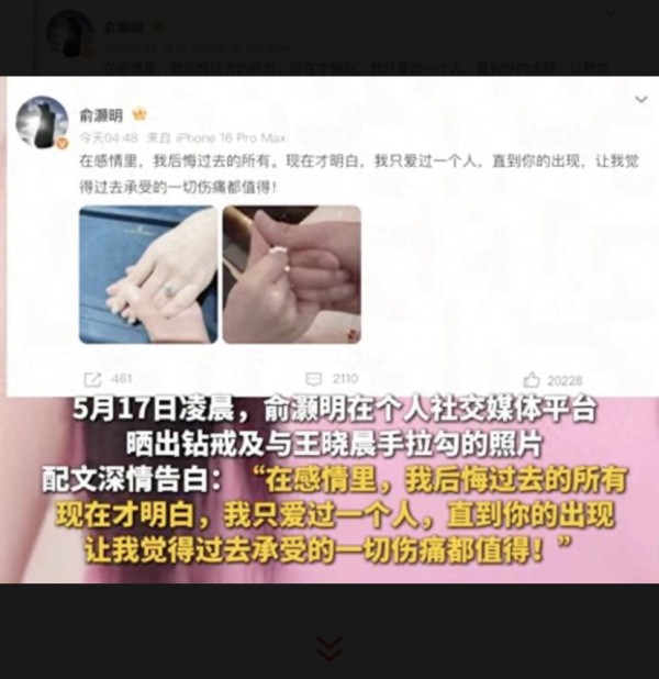 还有俞灏明和王晓晨,5月17日凌晨,俞灏明在社交平台晒出钻戒与两人手拉勾的合照,配文“在感情里,我后悔过去的所有”,正式官宣结婚。两人因2021年合作《惩戒者》相识,戏外关系逐渐升温,2024年就多次被拍到甜蜜互动,如今终于修成正果,网友们也纷纷送上祝福,为俞灏明感到高兴,称他涅槃重生终获幸福。
