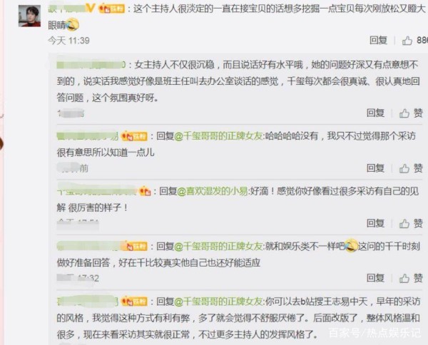 有网友留言道:女主持人不仅很沉稳,说话好有水平哦,她的问题好深又有点意想不到的感觉,而千玺每次都会很真诚、很认真地回答问题,这个氛围真好。说实话,我感觉好像是班主任叫去办公室谈话一样。