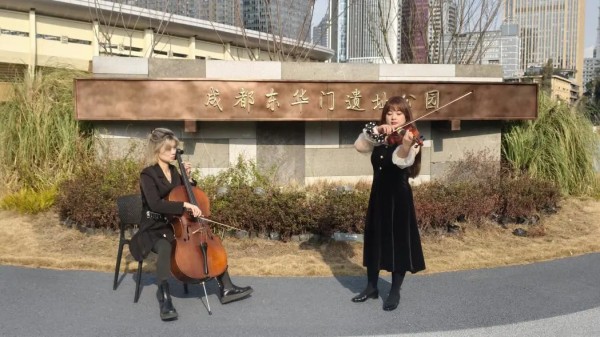 (大提琴和小提琴在东华门遗址奏响。成都市青羊区东华里沉浸式商业街区供图)