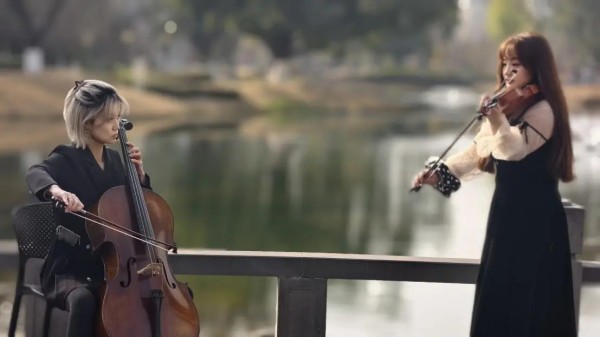 (大提琴和小提琴在摩诃池遗址奏响。成都市青羊区东华里沉浸式商业街区供图)