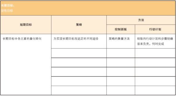 方法方法包括控制面板和行动计划两部分。控制面板用来检查策略是否走对了路,是否能促成目标的实现。行动计划将策略转化为具体的行动方案,明确每项行动的执行人以及完成时间。长期目标和短期目标共同定义了预期目标,而策略和方法则明确了实现方式。这样一来,长期目标的实现便落实到了日常工作中。