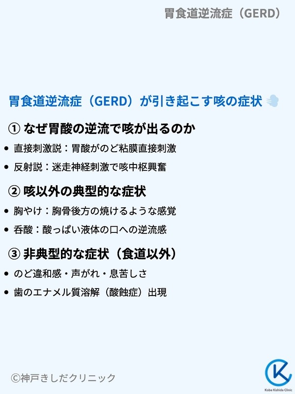 これは、逆流した胃酸や胃の内容物が、のど(咽頭・喉頭)まで達し、その粘膜を直接刺激することで咳反射が起こるというものです。