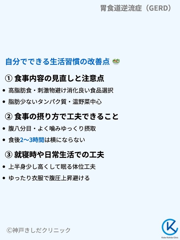 胃食道逆流症(GERD)の治療において、薬物療法と並行して生活習慣を見直すことは非常に重要です。日々の少しの工夫が、症状の緩和に大きく貢献します。