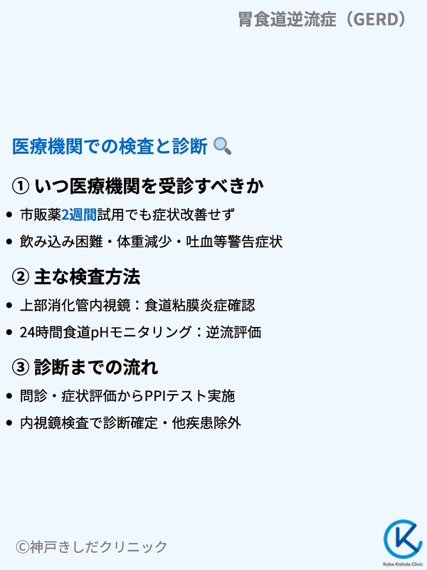 多くの場合、まずは問診と症状の評価から始まります。典型的な胸やけや呑酸がある場合、PPIテストで治療と診断を同時に進めることもあります。