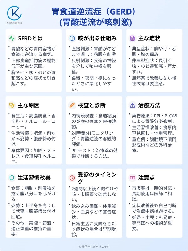 特に、食後や横になったときに咳が出やすい、胸やけやのどの違和感を伴う場合、その咳は「胃食道逆流症(GERD)」による胃酸の逆流が原因かもしれません。
