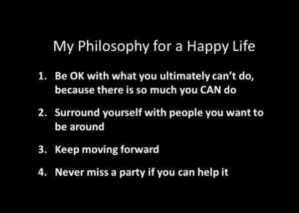 and it was a dream that I just had to accomplish. However, nothing was going to stop me from playing snare drum with the marching band in the halftime show. .I just want to give you some more information about Progeria. and because of this I was interviewed on NPR, and John Hamilton asked me the question: “What is the most important thing that people should know about you?” And my answer was simply that I have a very happy life.So even though there are many obstacles in my life, with a lot of them being created by Progeria, I don’t want people to feel bad for me. I don’t think about these obstacles all the time, and I’m able to overcome most of them anyway.So I’m here today, to share with you my philosophy for a happy life. So, for me, there are 3 aspects to this philosophy. So this is a quote from the famous Ferris Bueller.“Life moves pretty fast. If you don’t stop and look around once in a while, you could miss it.” – Ferris Bueller“I’m okay with what I ultimately can’t do”The first aspect to my philosophy is that I’m okay with what I ultimately can’t do because there is so much I can do.